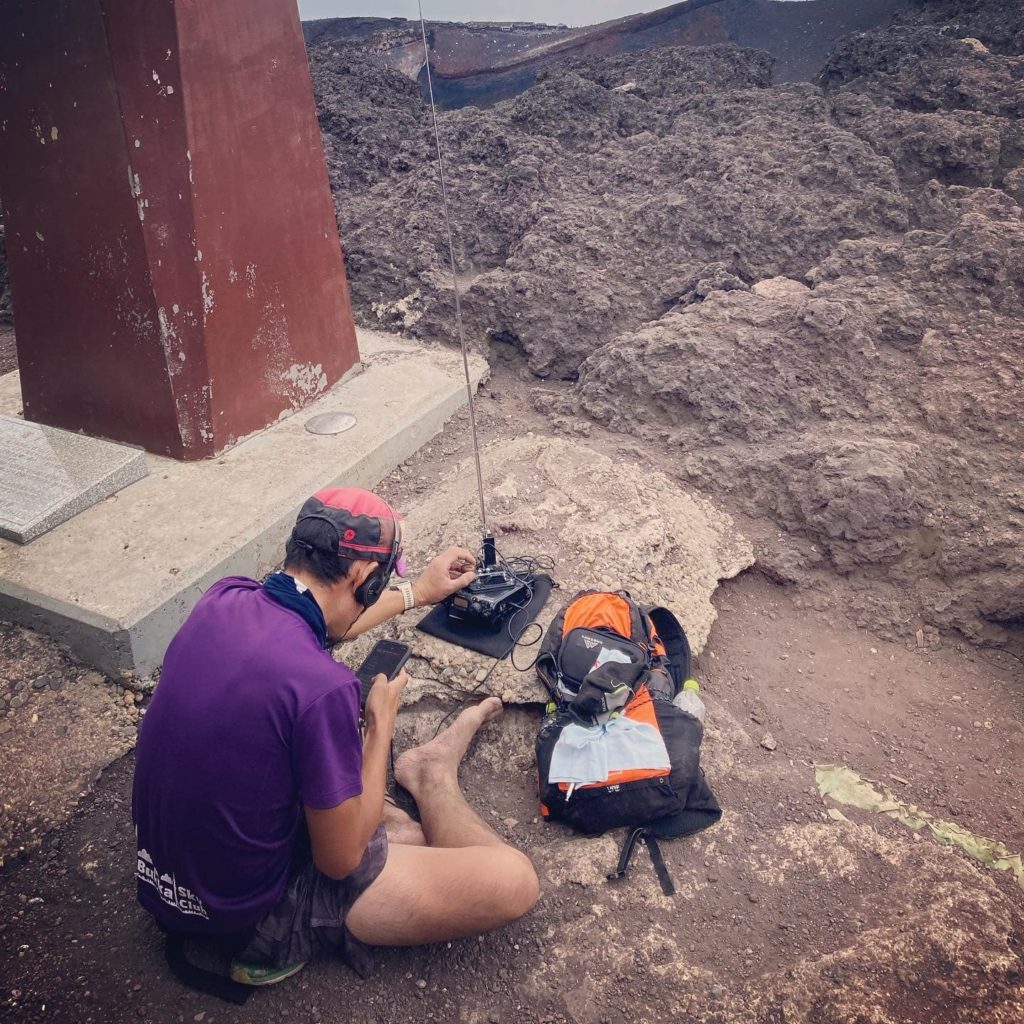 せっかく日本で一番高いところに来たのだからと無線機を設営。YAESU FT-818ND初めての本格山岳運用だった。アンテナは8月に買ったばかりの簡易アンテナ「GAWANT7」7MHzでTwitterで無線の先輩と連絡を取りながら交信を試みたけれど、受信はできても、こちらの電波が届かない状況が続き、結局1局も交信できず。後から聞いた話ではこの日はコンディションが悪かったらしい。小型のアンテナなのでなかなか遠くに電波を飛ばすには好条件下でないと難しいようだ。下山時間が迫っていたので7MHzでの交信はおしまいにして、別の無線機(ハンディ機/YAESU FT-3D)で430MHzで4局と交信。4局以上ならSOTAのアクティベーションとしても成功になるので、HFはだめだったが、VUで成功。ハンディー機持って行ってよかった。