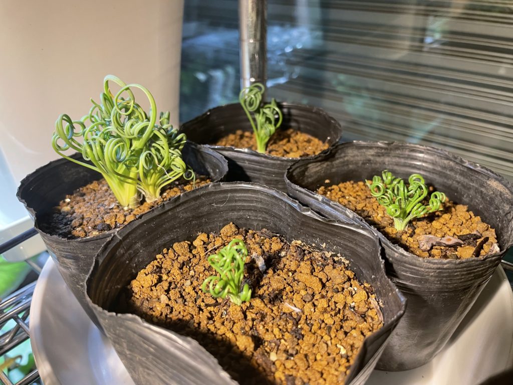 中には葉の巻きが戻りにくいものもあります。こういう個体を選別していけばより鑑賞価値が高いアルブカが出来上がるのでは考えています。食べれない植物も種とりして改良。一体何年かかるのか分かりませんが、自然農以上にマニアな趣味ですね。