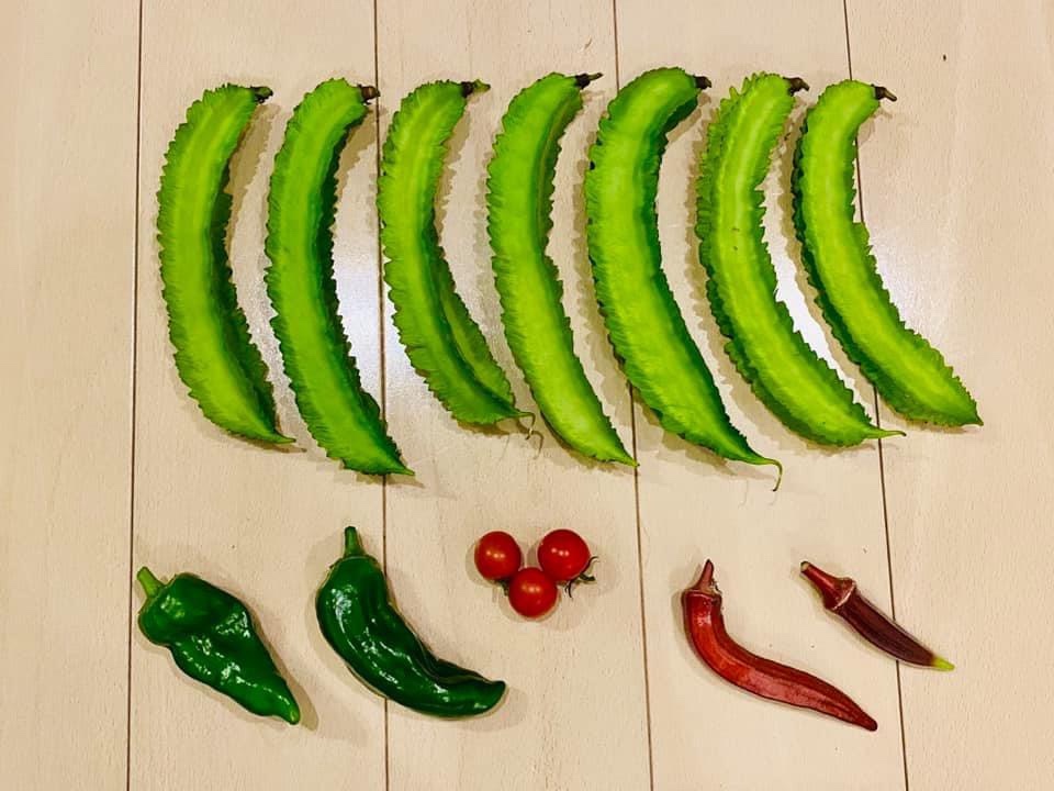 仕事帰りにマキノフ農園に寄ると、シカクマメがたくさん実っていた。実が充実してきた7個を収穫。後は赤オクラ、ピーマン、ステラミニトマトを収穫。