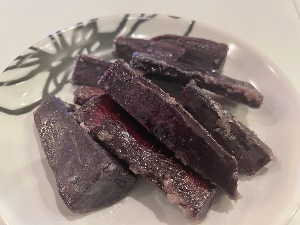 僕の好物「大学芋」畑でとれたサツマイモ「パープルスイートロード」を使ってマナさんが作ってくれました。紫色だから黒糖かりんとうみたい。あっという間に完食してしまった。