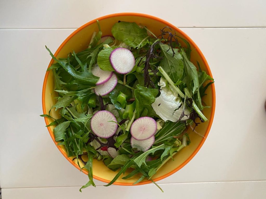 木曽カブ、ミズナ、ルッコラ、赤リアスカラシナ、シカクマメ、ラディッシュのベビーリーフのミックスサラダ
