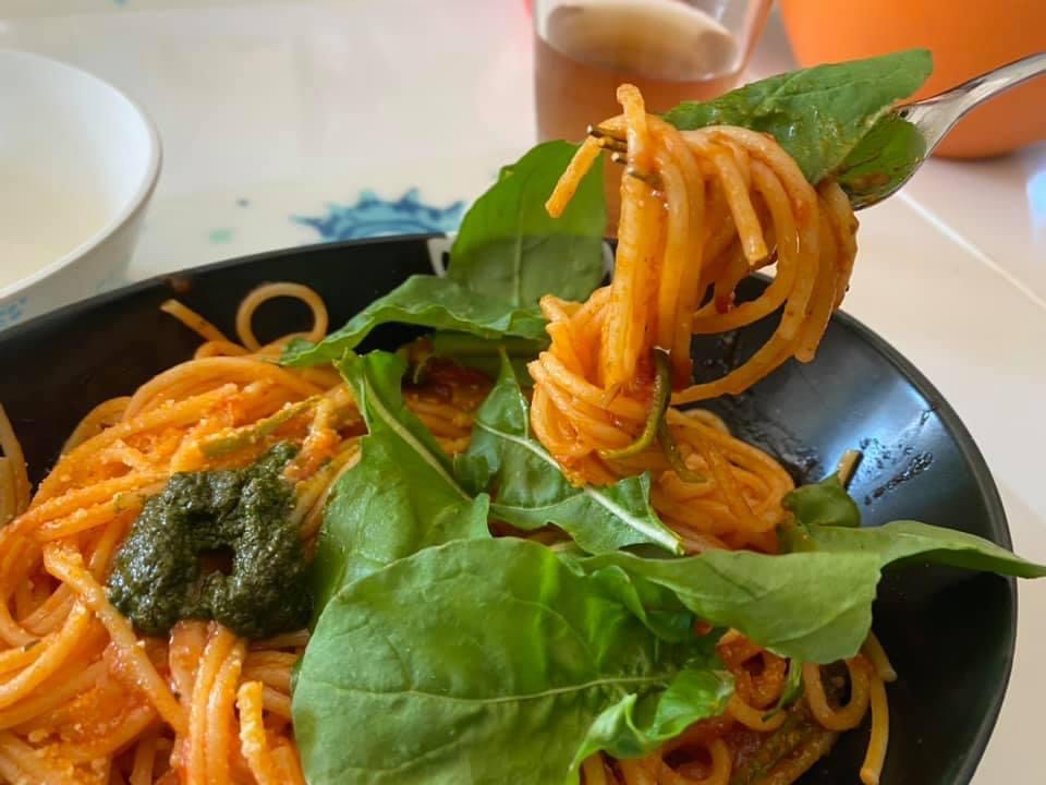パスタにバジルのジェノベーゼと生のロケットを大量投入。