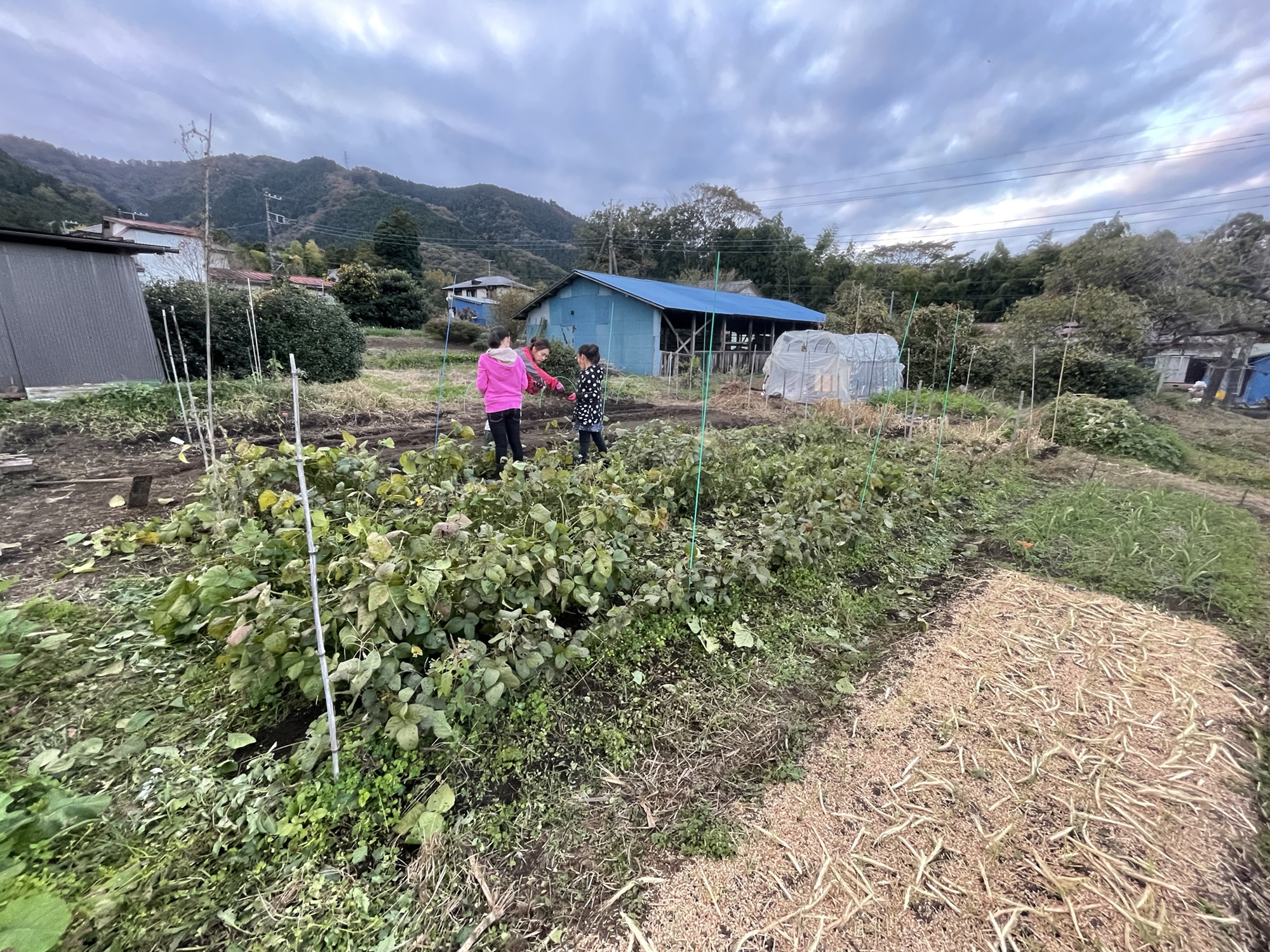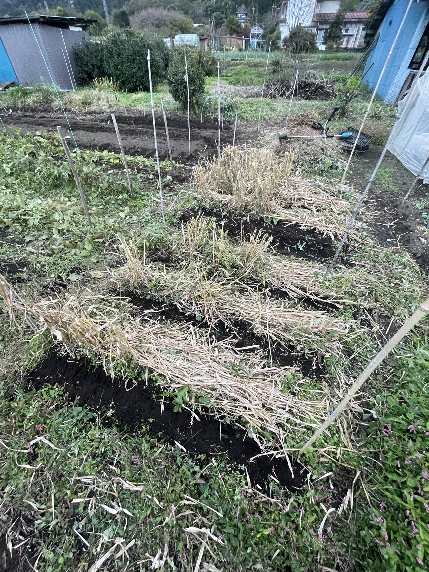 加えて先に育っている大豆、モチキビの間に播く事で防寒。効果を確認したいので防寒有り耕区と防寒なし耕区に分けた。これで播種適期とこの畑での栽培方法を探る。