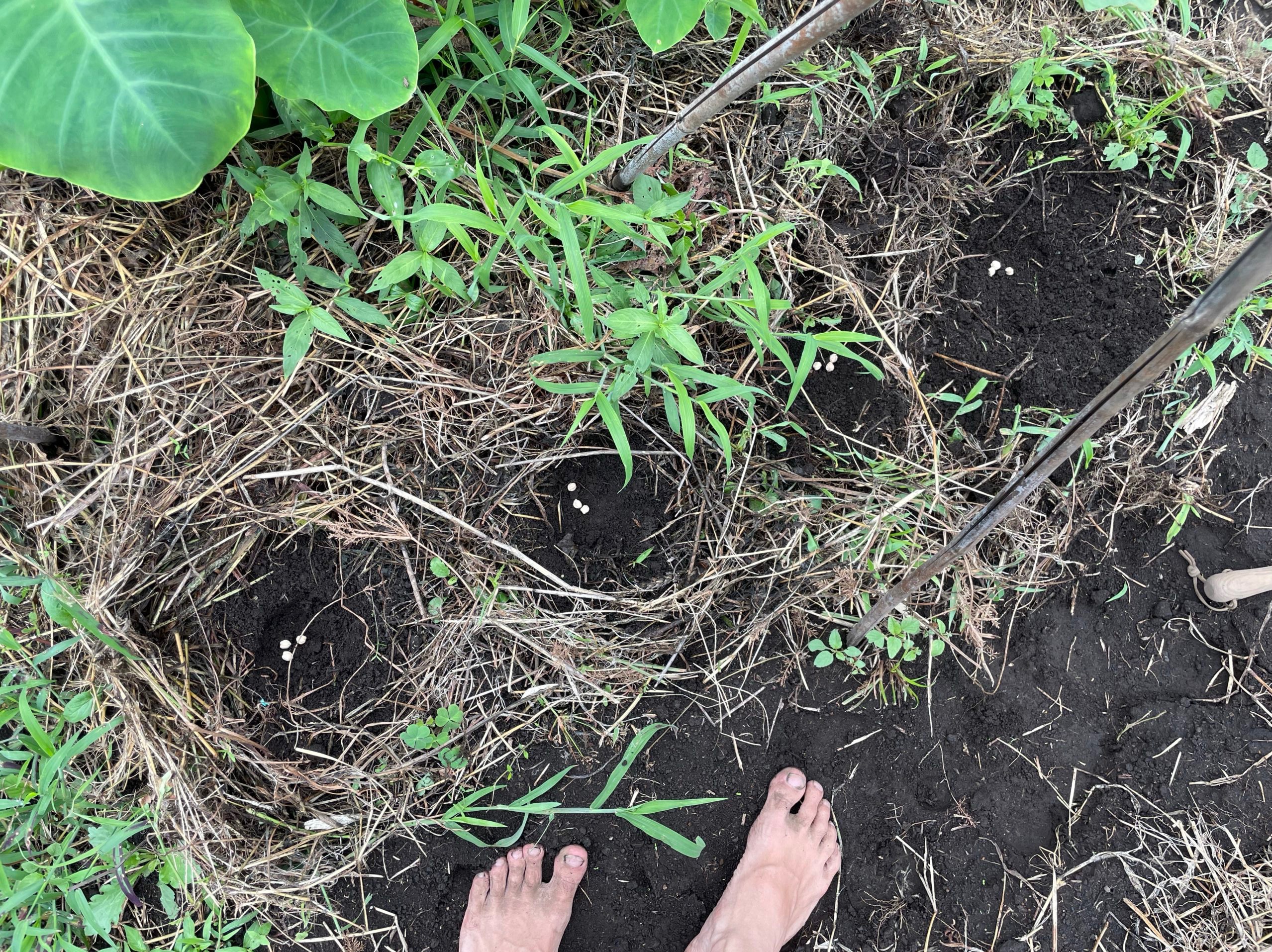 鞘の可愛さでつい買ってしまったひよこ豆。30センチくらいの間隔で適当に播いてみた。どんな姿になるのだか楽しみ。