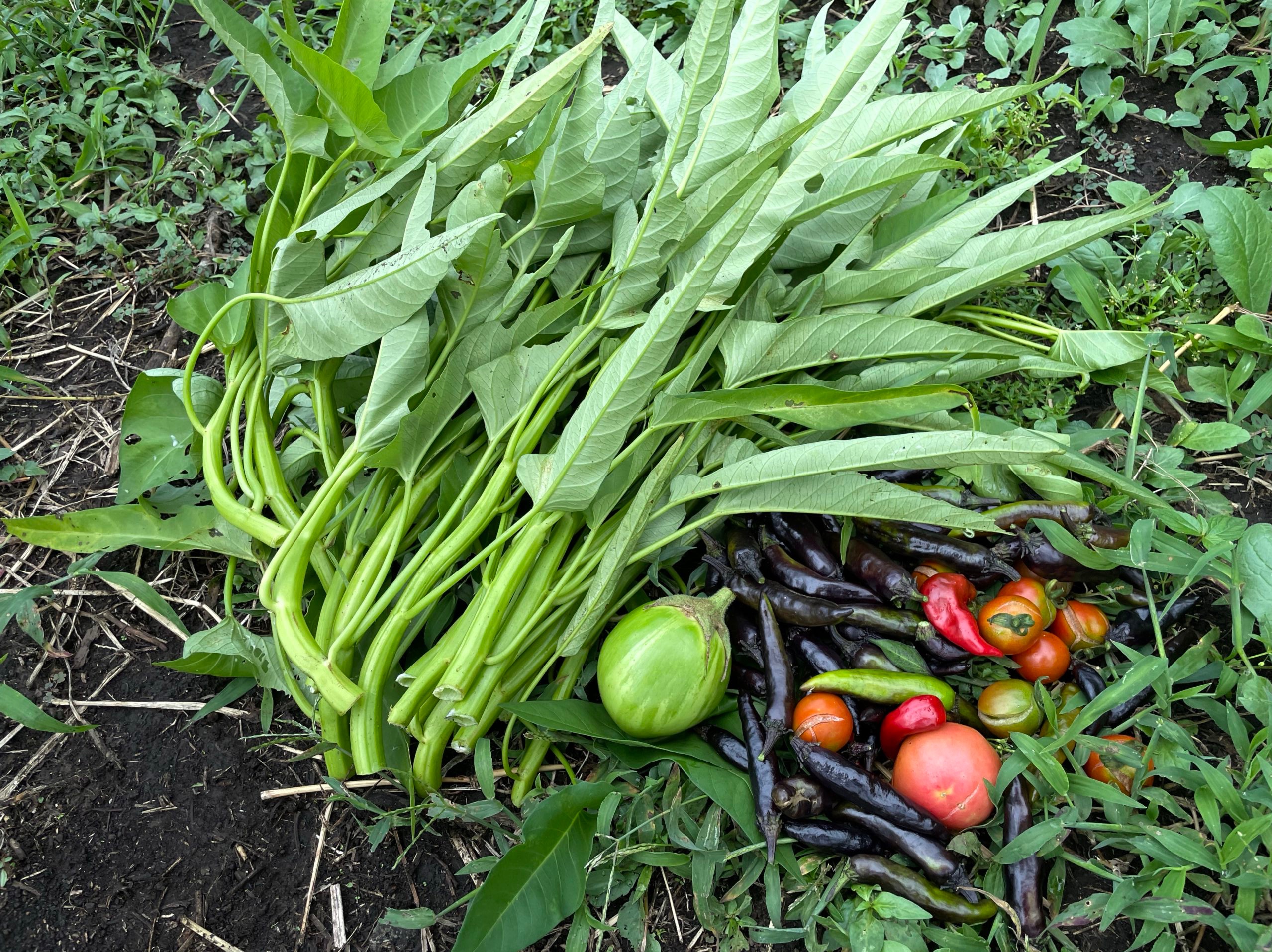 今日の収穫は空芯菜、紫唐辛子、緑ナス、ステラミニトマト、アロイトマト。トマトは雨で割れたり、タバコガの幼虫が入ってしまって半分以上は土に還している。