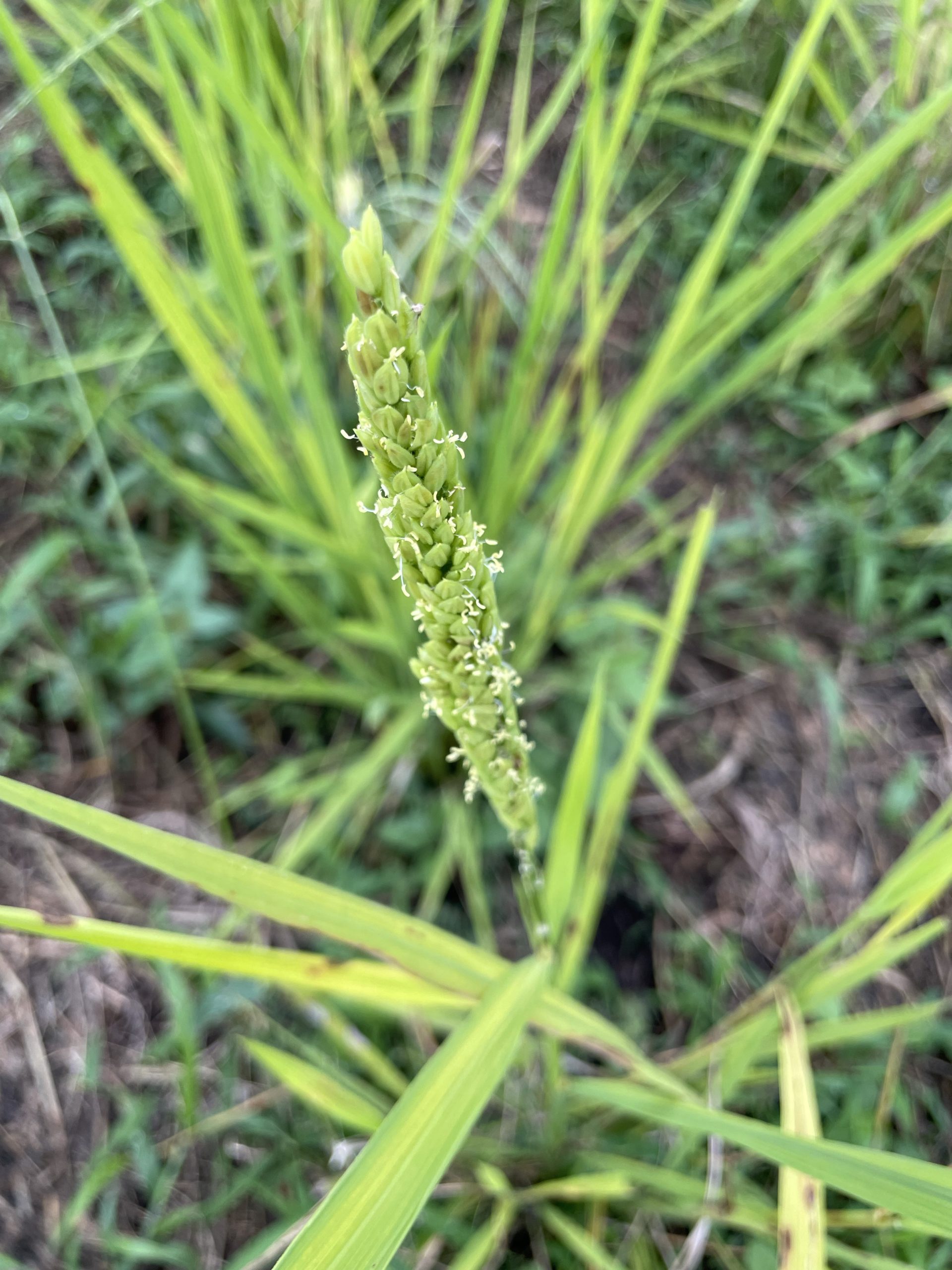 生育不良と枯れがひどいハッピーヒル。それでも所々出穂している。穂が上に伸びてきたが、噂どおり不思議な形の稲穂だ。