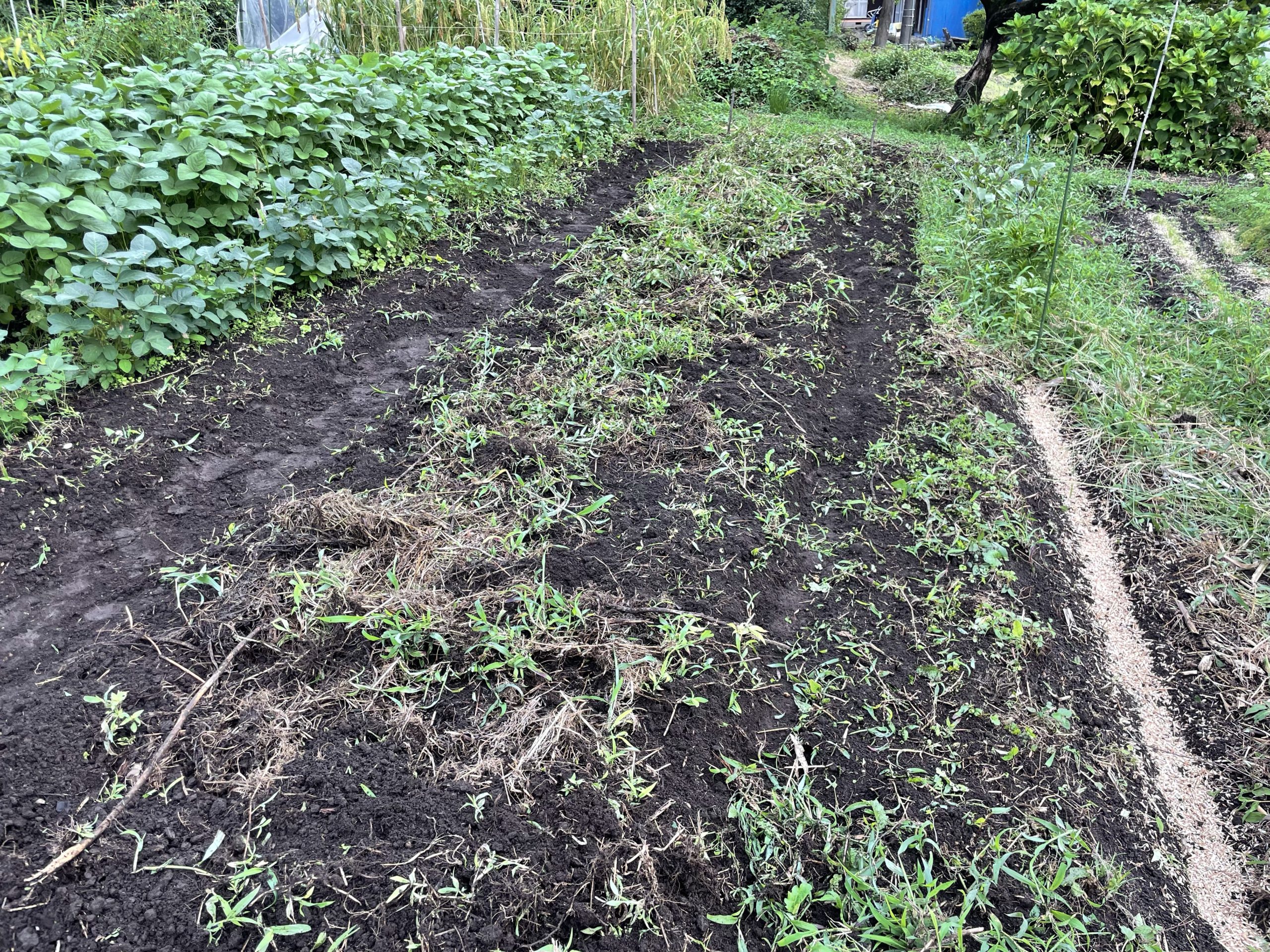 ニンニクとタマネギ畑の準備。生い茂っていたイチゴと雑草をクワで刈り払い、崩れた畝と排水路を修正。