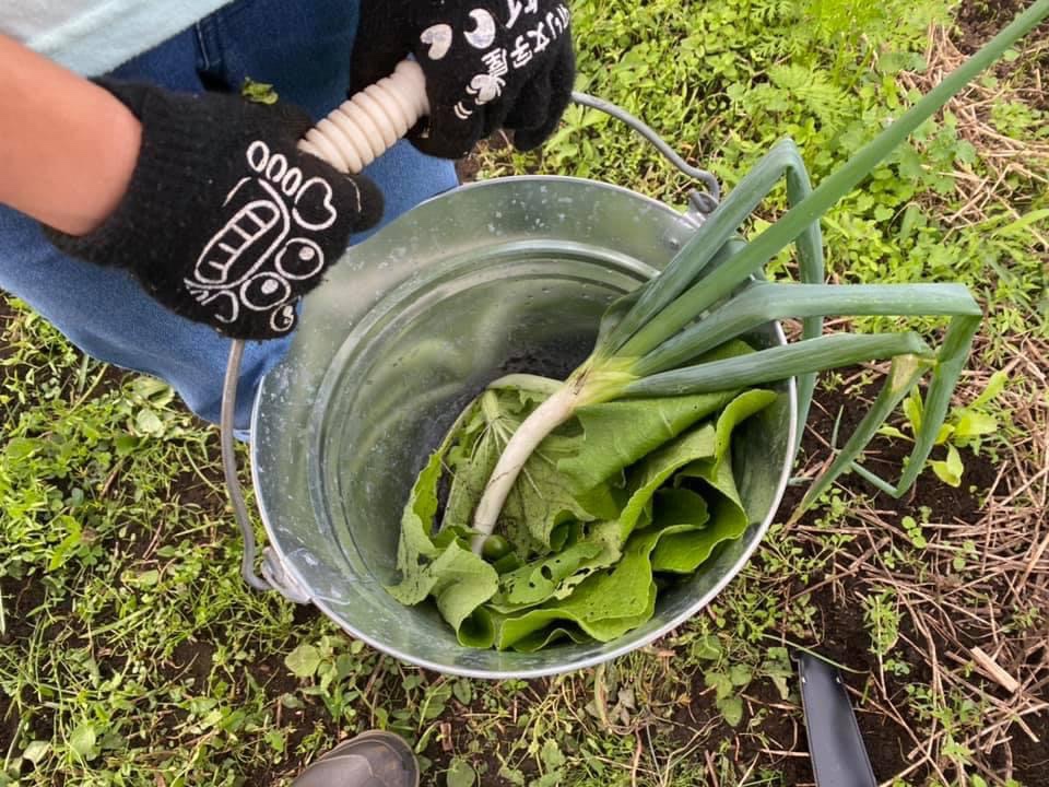 午後は子供達も連れて再度畑へ。子供達は各自世話している区画のハクサイの間引きにチャレンジ。長女、2株のハクサイを1本にしようとしたけど、2株とも切ってしまう。