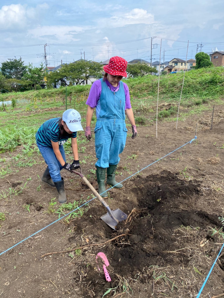4本目の畝づくり。畝立てする場所全体にスコップを入れ、埋まっている石や異物がないか点検。「カラムシ」という宿根草のゴボウのような根っこがそこら中に蔓延っているので一株ずつ丁寧に取っていく。根っこ取りの後は畝立て。マキノフ農園は畝幅1m、畝間50㎝で畝を作っていたけれど狭くて作業性がイマイチだったので、今回は畝幅120㎝、畝間80㎝で造成。