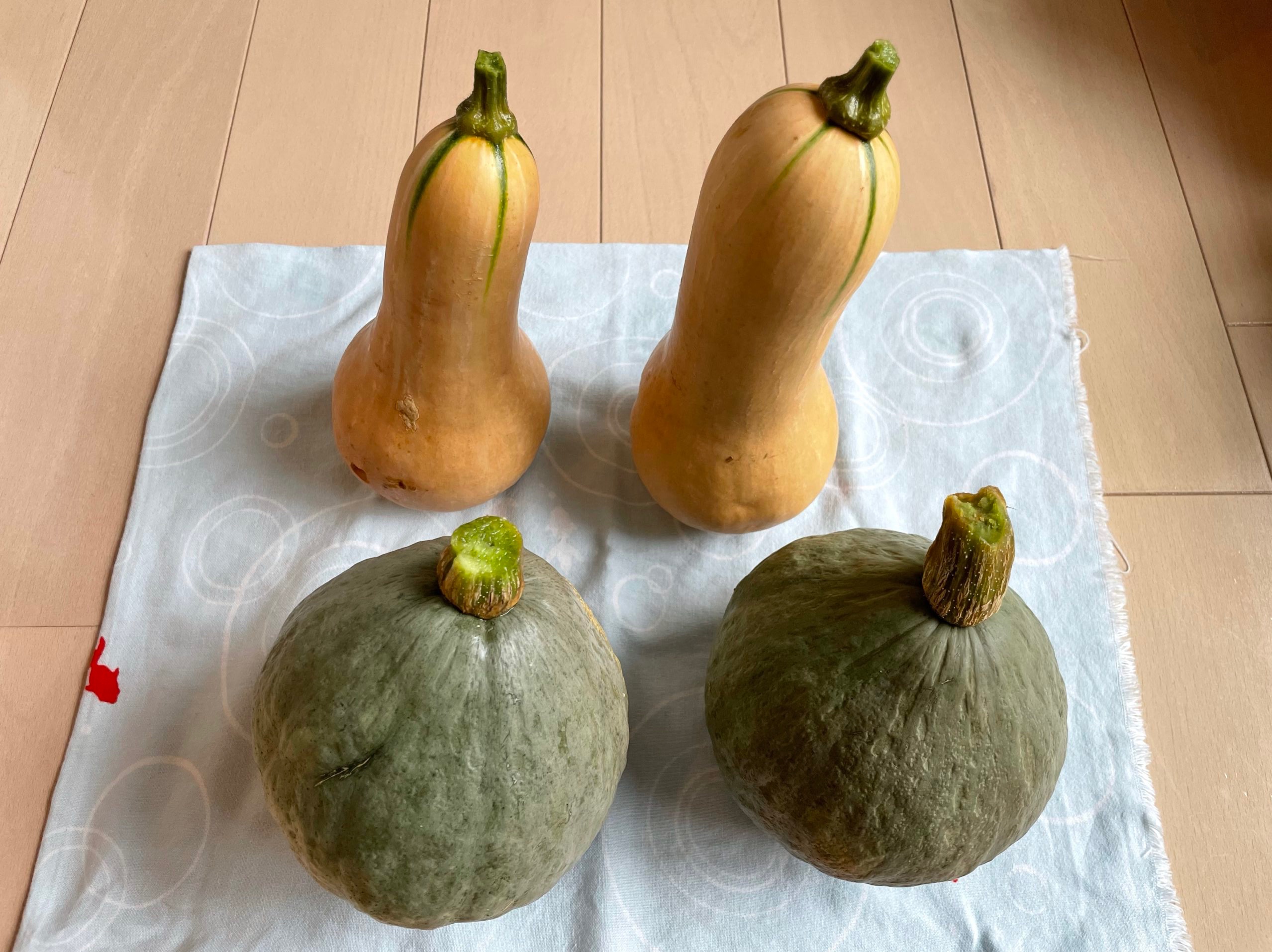 2種類作っているカボチャ。前の畑で種取りしてきた、ひょうたんみたいな形のバターナッツカボチャはまだまだツルも元気。カチワリは今回大きなものが2つ取れたけれど、ツルは殆ど枯れてしまった。まだ愛川に馴染んでいないかな‥