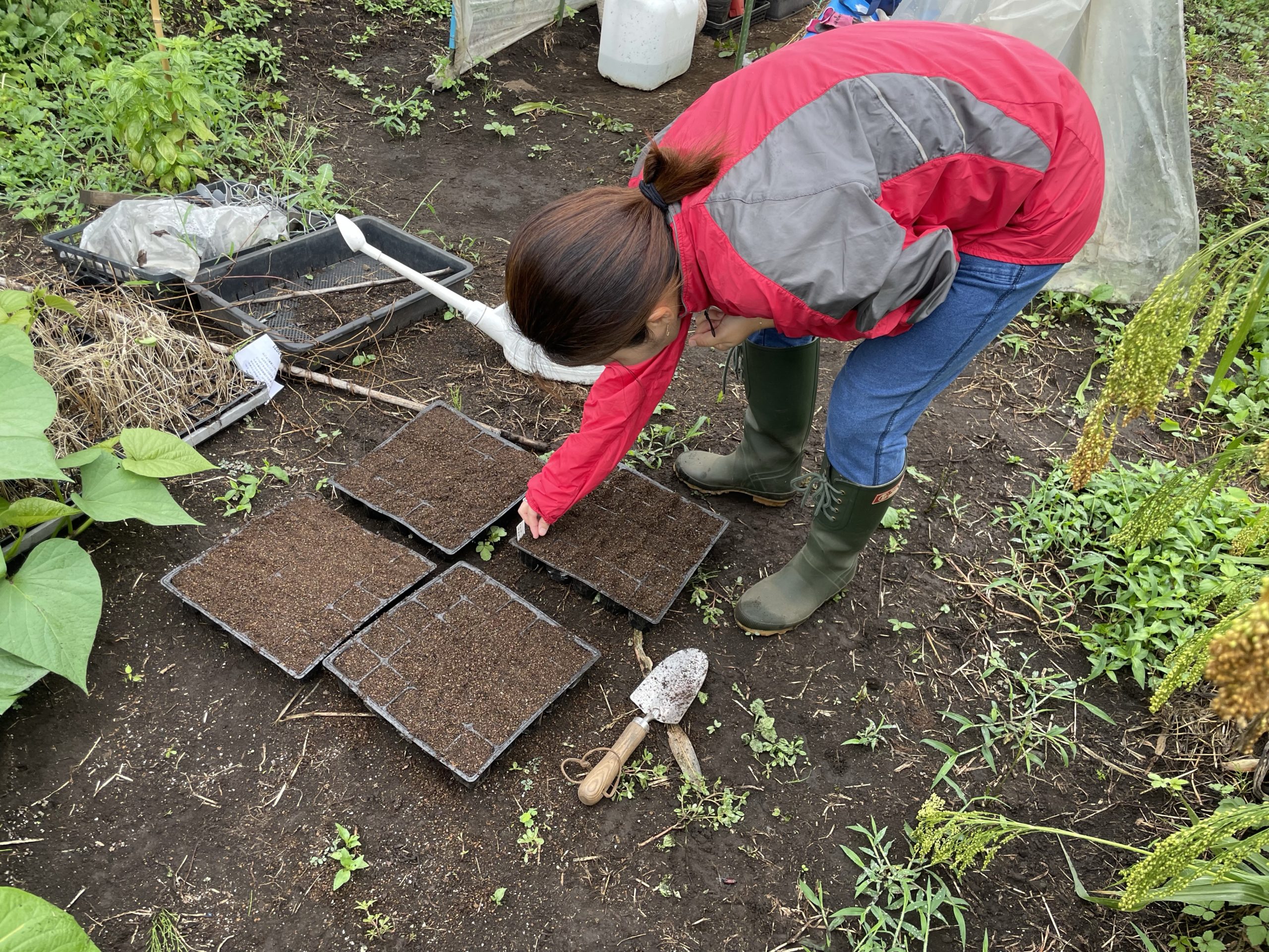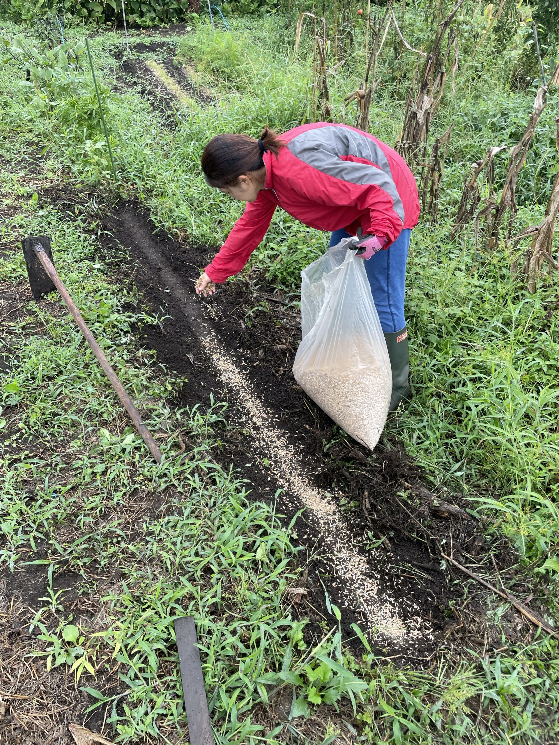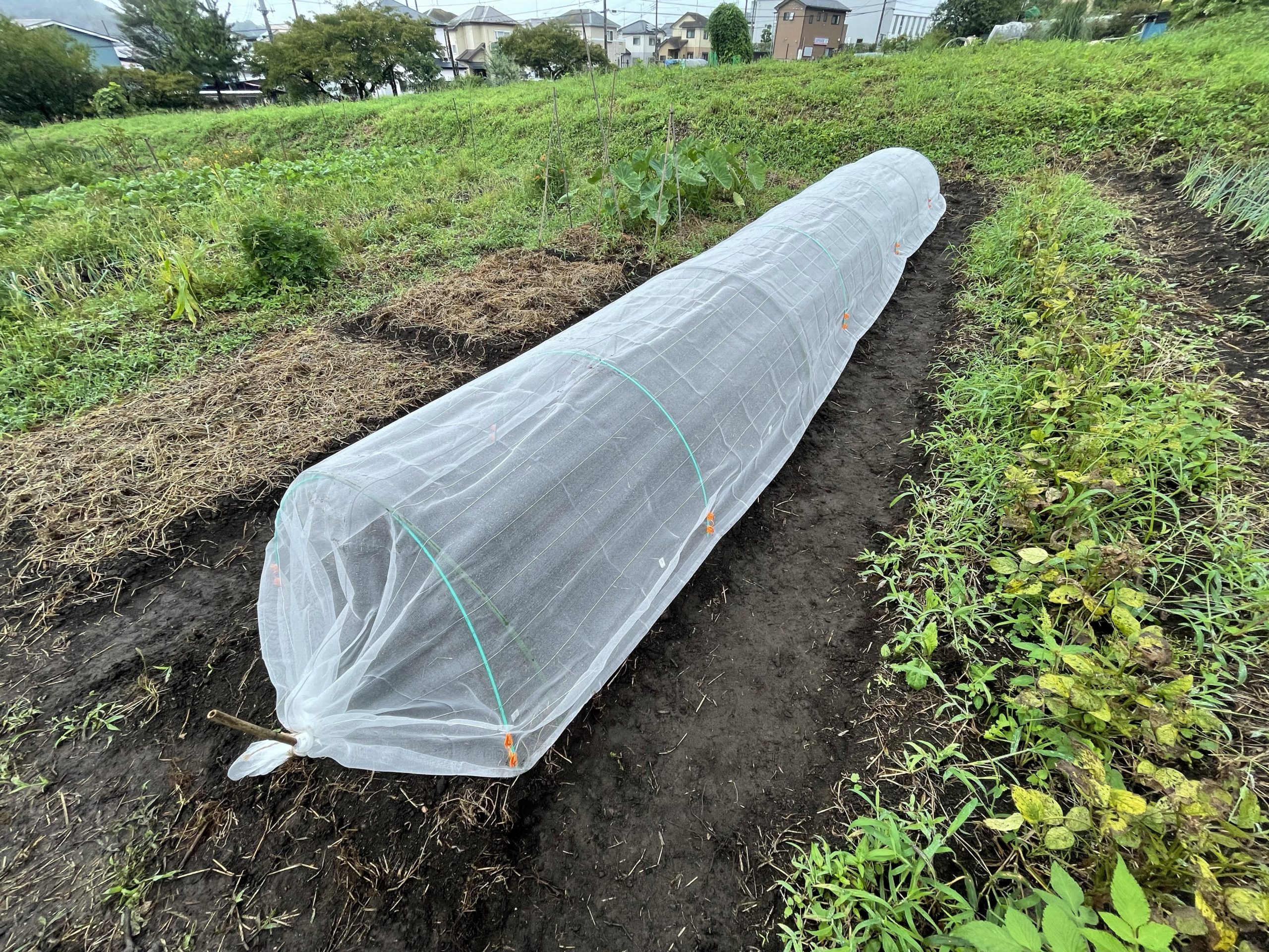 冬の葉物野菜の種播きをスタート。昨年はこの土地で初めての耕作だったので、虫の対策などは特に行いませんでした。結果として、寒くなるまではカブラハバチ、ダイコンサルハムシが大量発生。捕殺に明け暮れる日々‥。今年は防虫網をかけてのんびり栽培したいと思います。