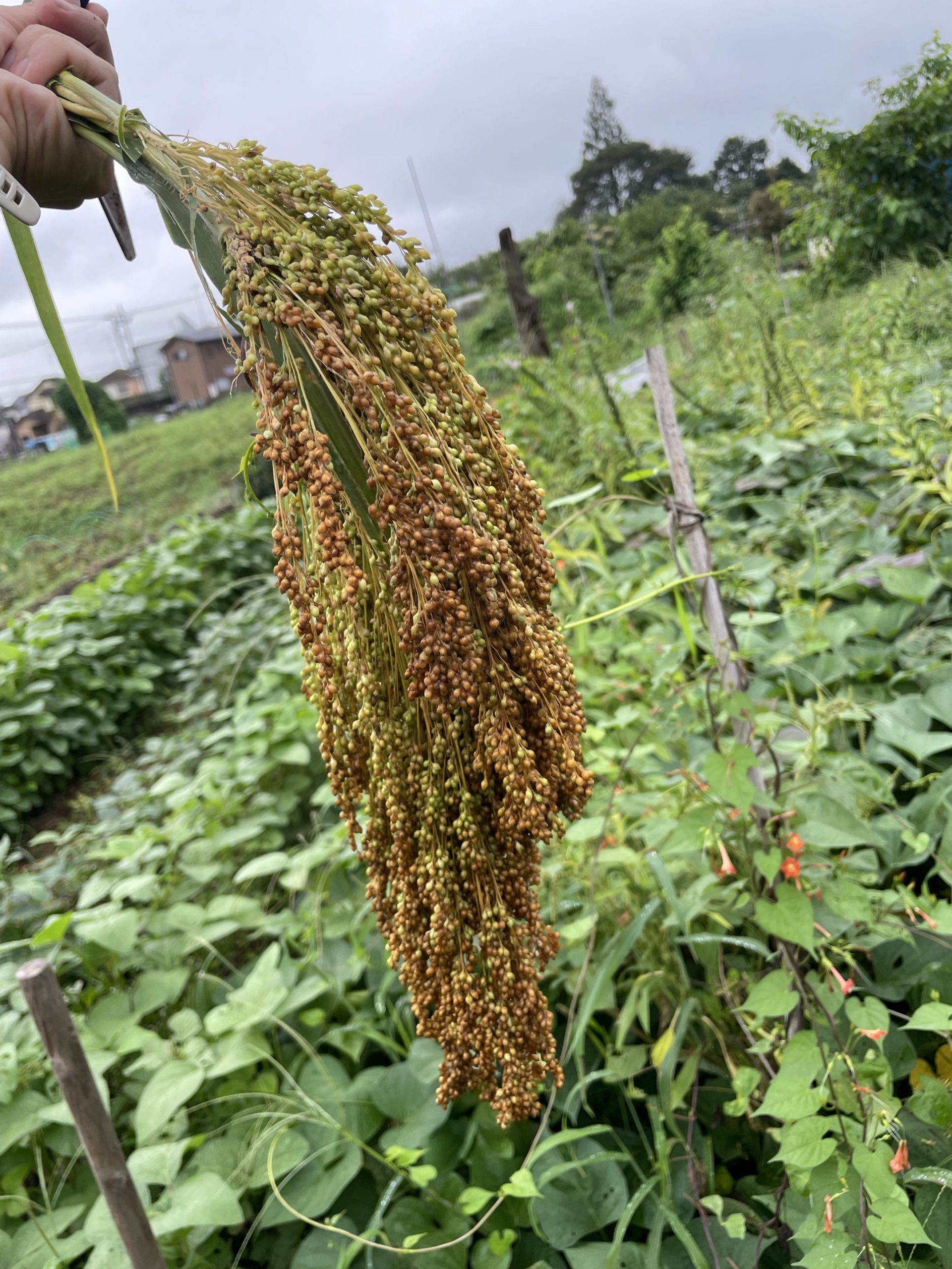 モチキビも半分以上が茶色く色づいた穂が出てきたので、順次刈り取り。しばらくハウス内で乾燥しておきます。