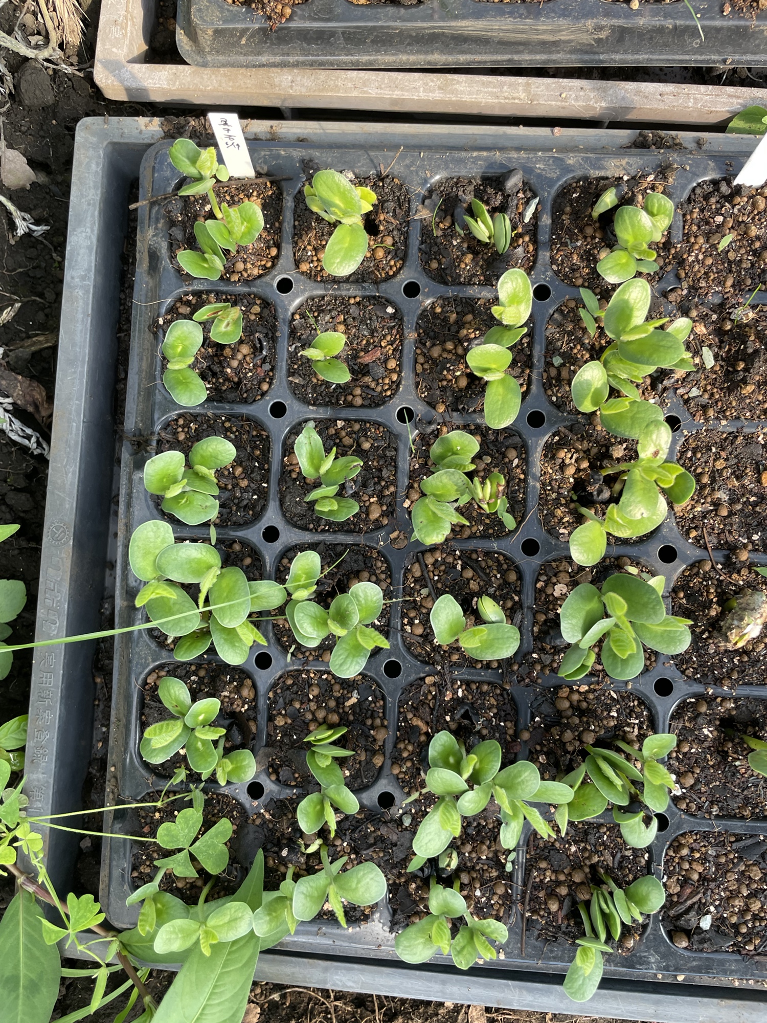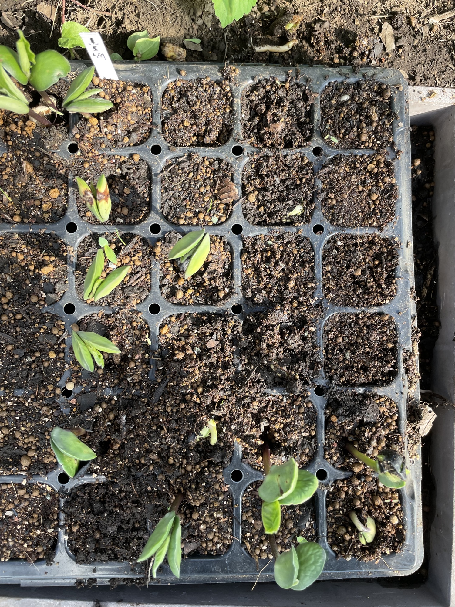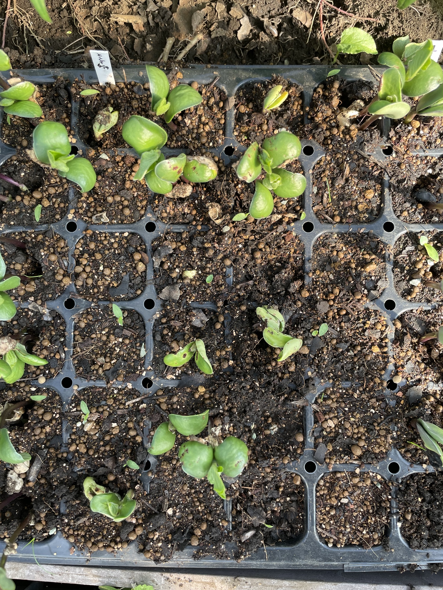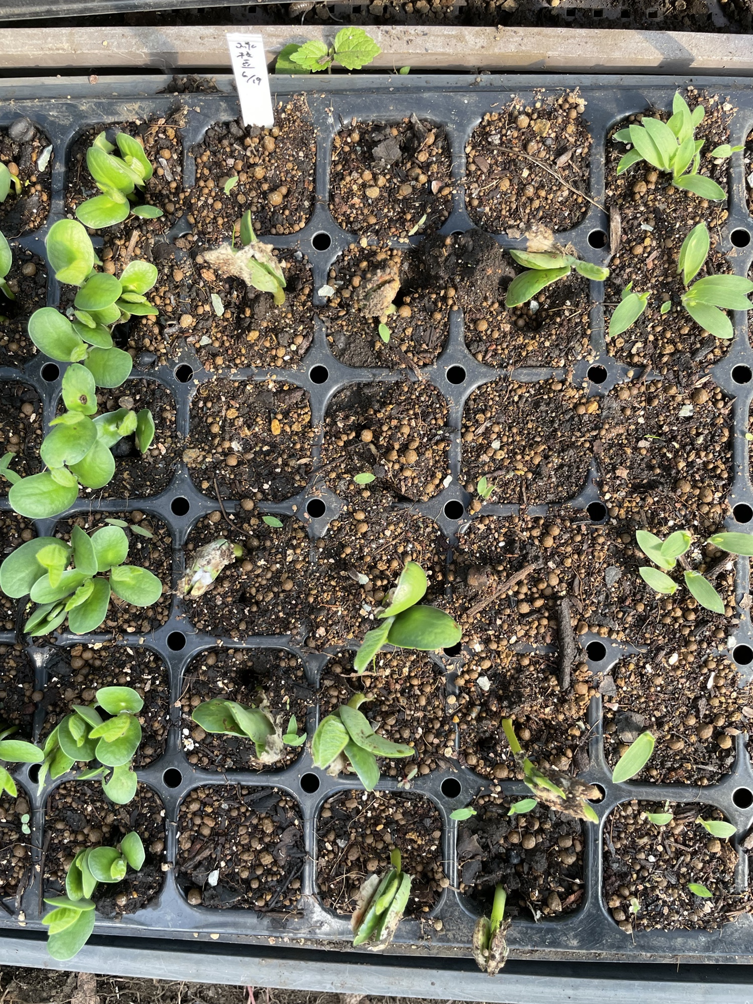 豆類の種播き後6日経過。発芽状況をチェックする。ひと穴に播いた種の数が異なるので、発芽率はセルトレイのセル数でカウント。