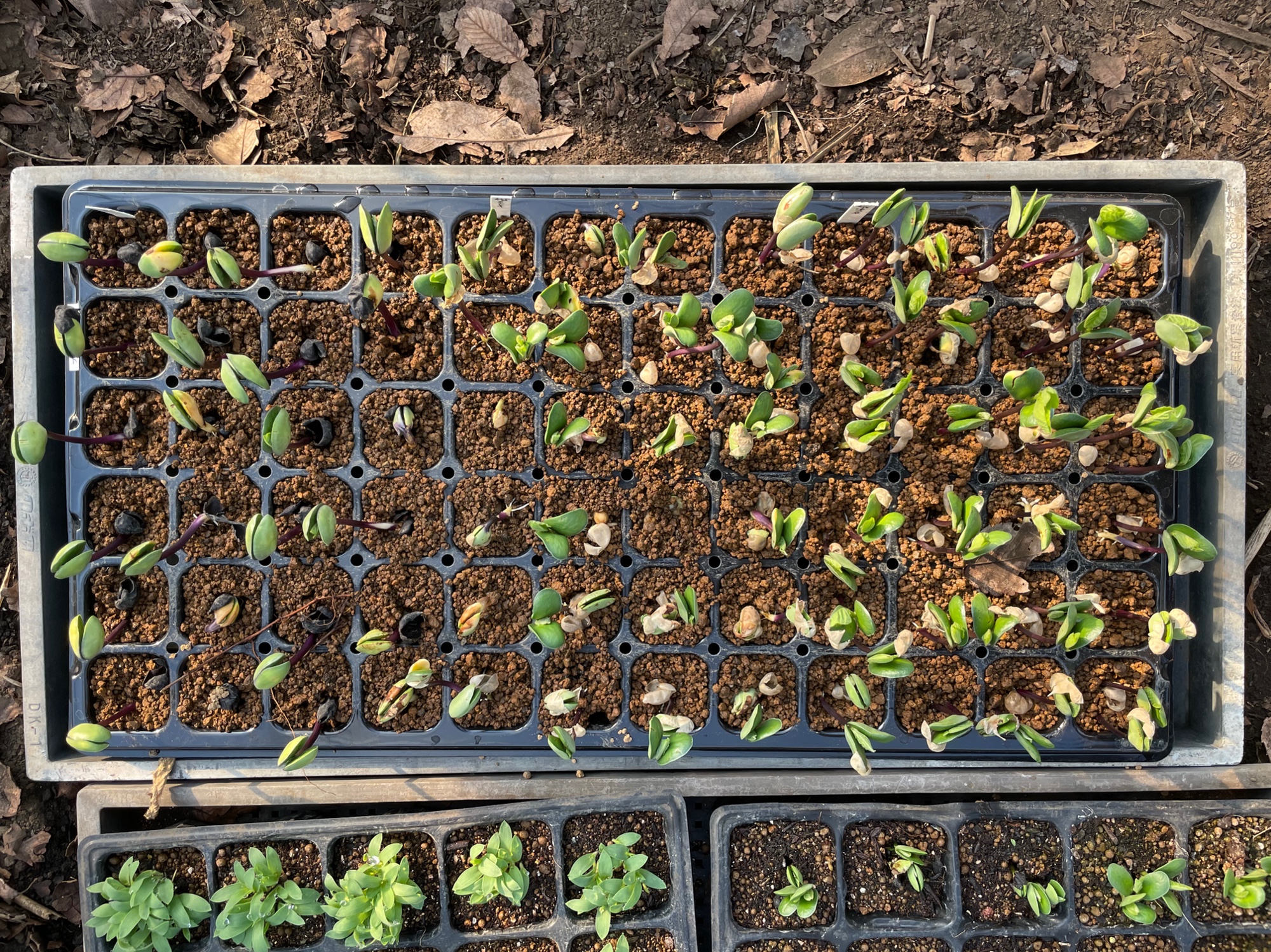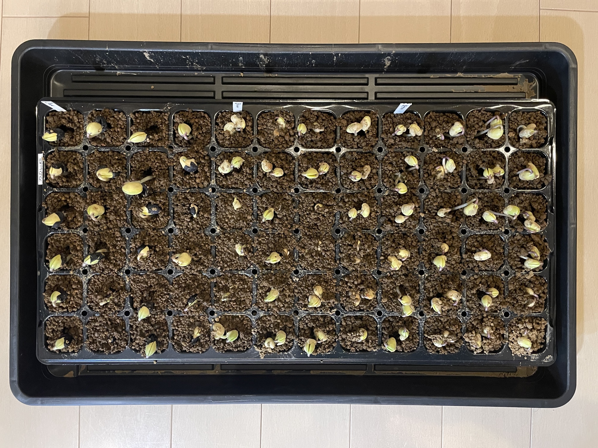 前回は自家製培養土(温床に使った腐葉土と畑土ミックス)で発芽がよく無かったので、用土を赤玉にしてやってみました。前回同様、丹波黒は1粒ずつ、他は2粒ずつ播いているので、一般的な発芽率とは違いますが、前回の比較として記録です。
