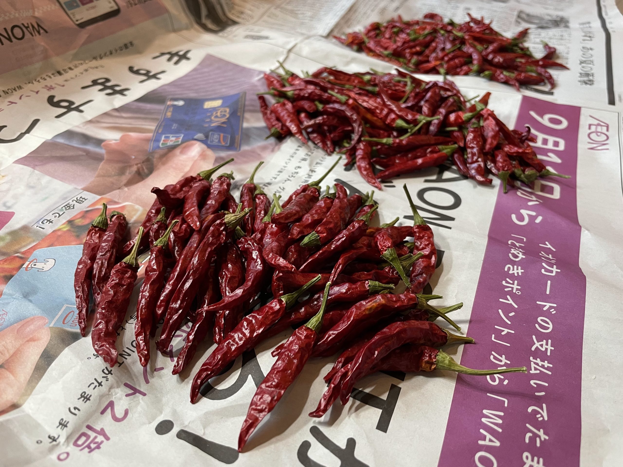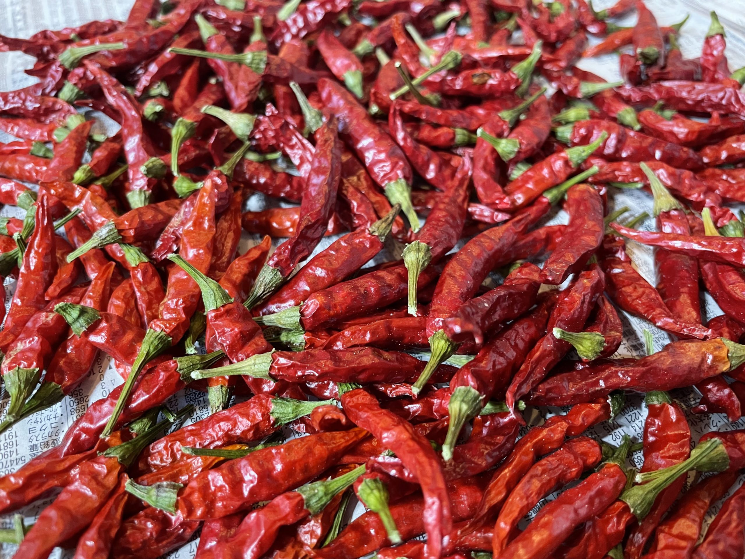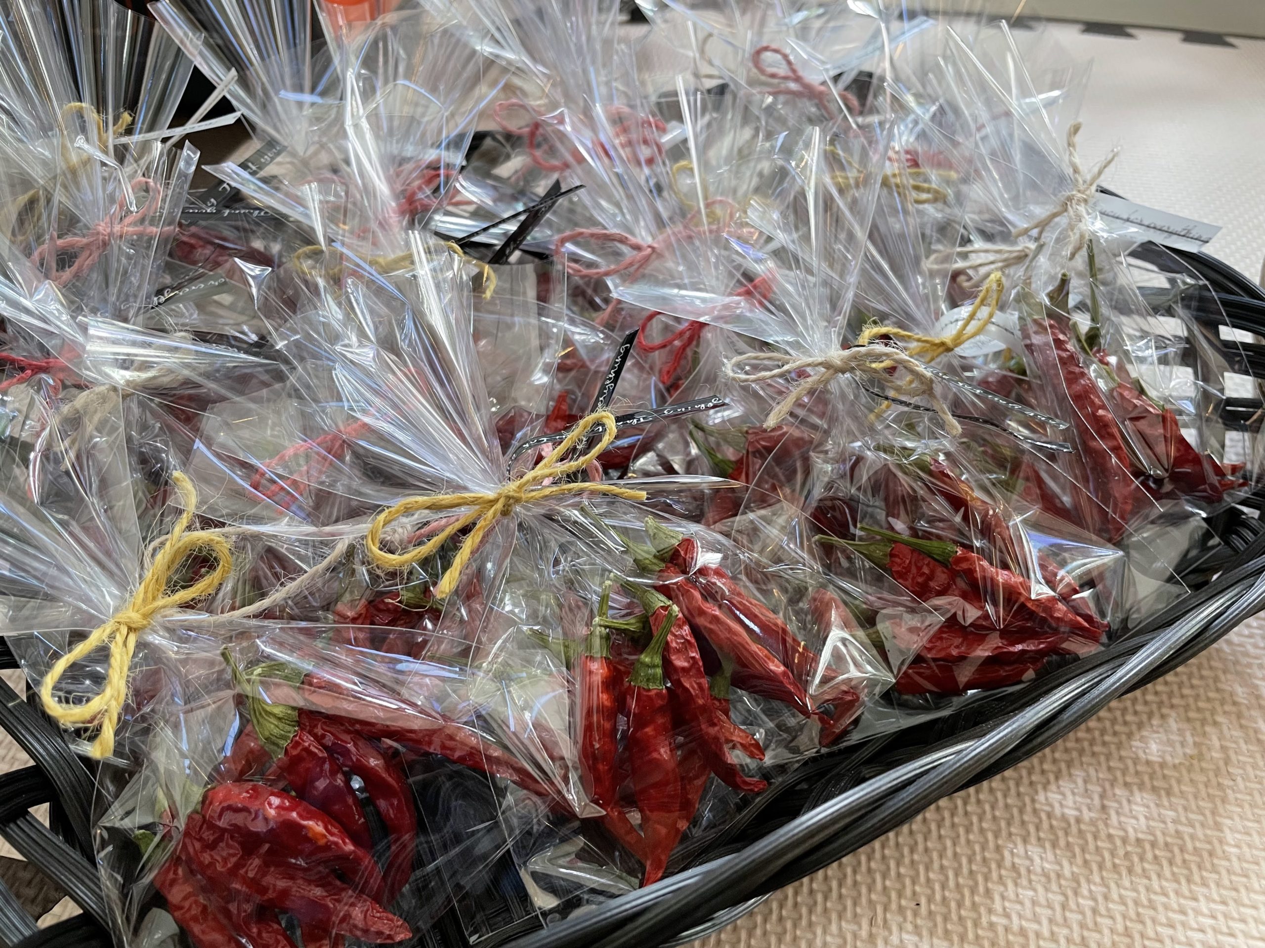 本番前日に八房唐辛子が自宅で消費しきれない量があったので、急遽クリスマスツリーのオーナメント風にラッピングして販売する事にしました。