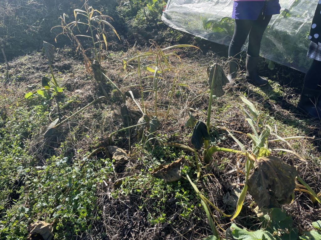 今日は霜に何度か当たってクタクタになってしまった里芋と生姜を収穫しに来ました。ちょっと霜に当てすぎた感じですが、芋は無事でしょうか。
