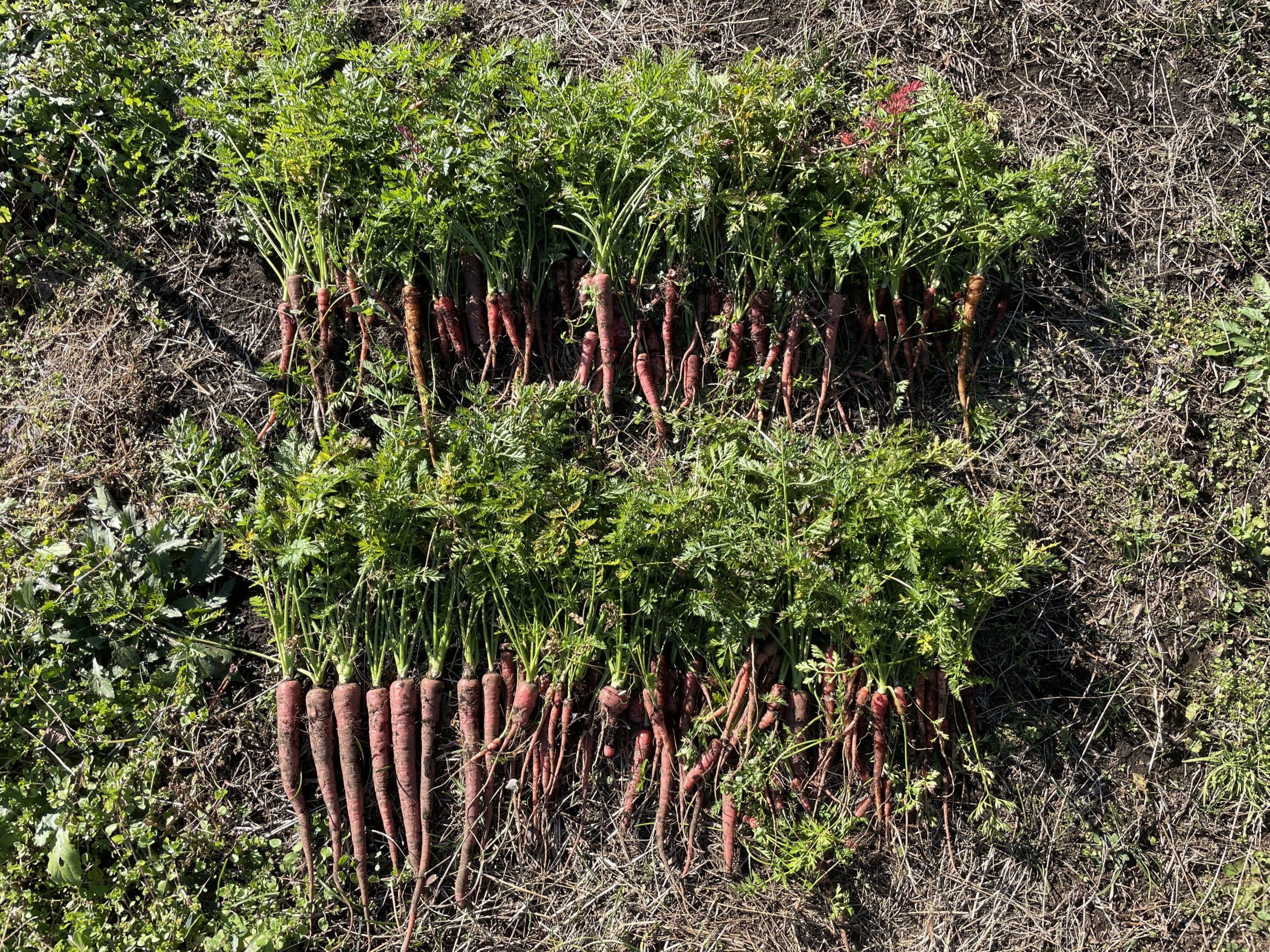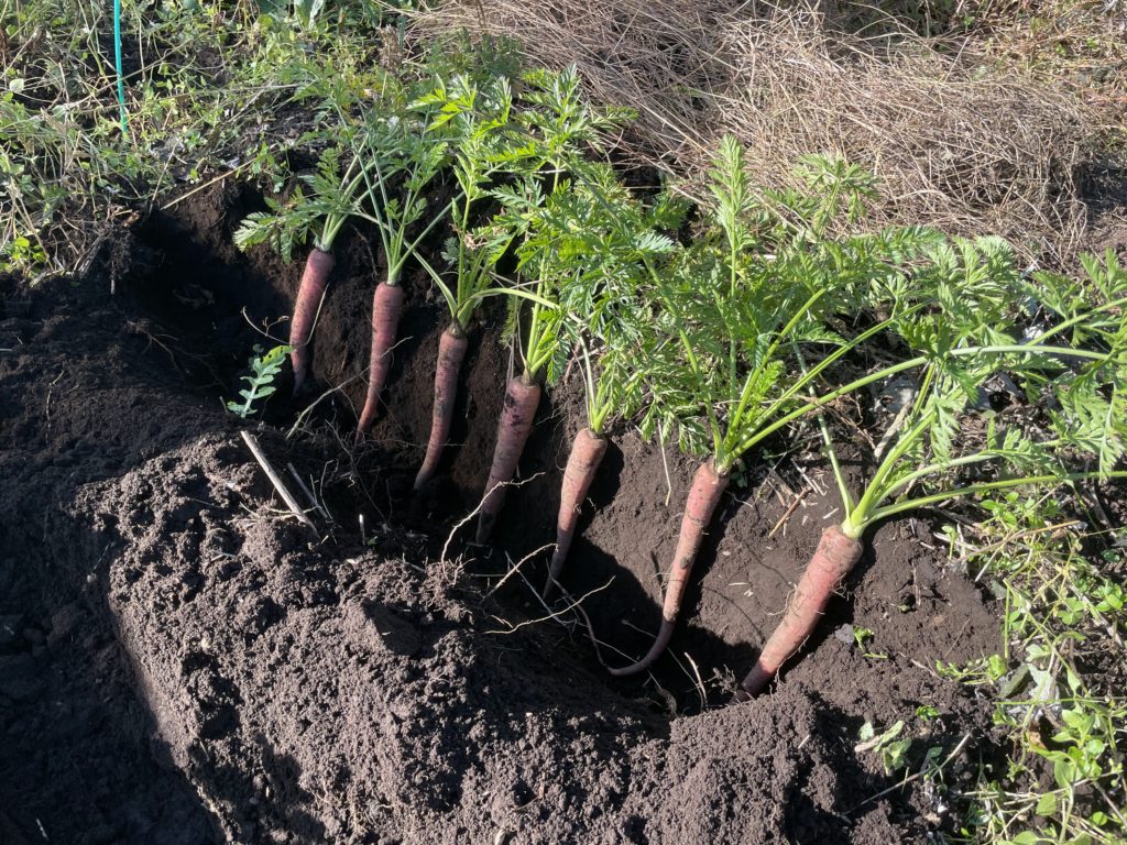 最後は金時ニンジンの収穫。こちらも種播き、生長の遅れからあまり大きくならぬまま収穫となりました。小ぶりではありますが、美味しそうです。母本を選抜して移植、冬越し準備をしました。昨年は冬の寒さで母本の苗が凍ってしまい、かなり開花する株数が半減したため、今回は防寒のためビニールをベタがけしました。