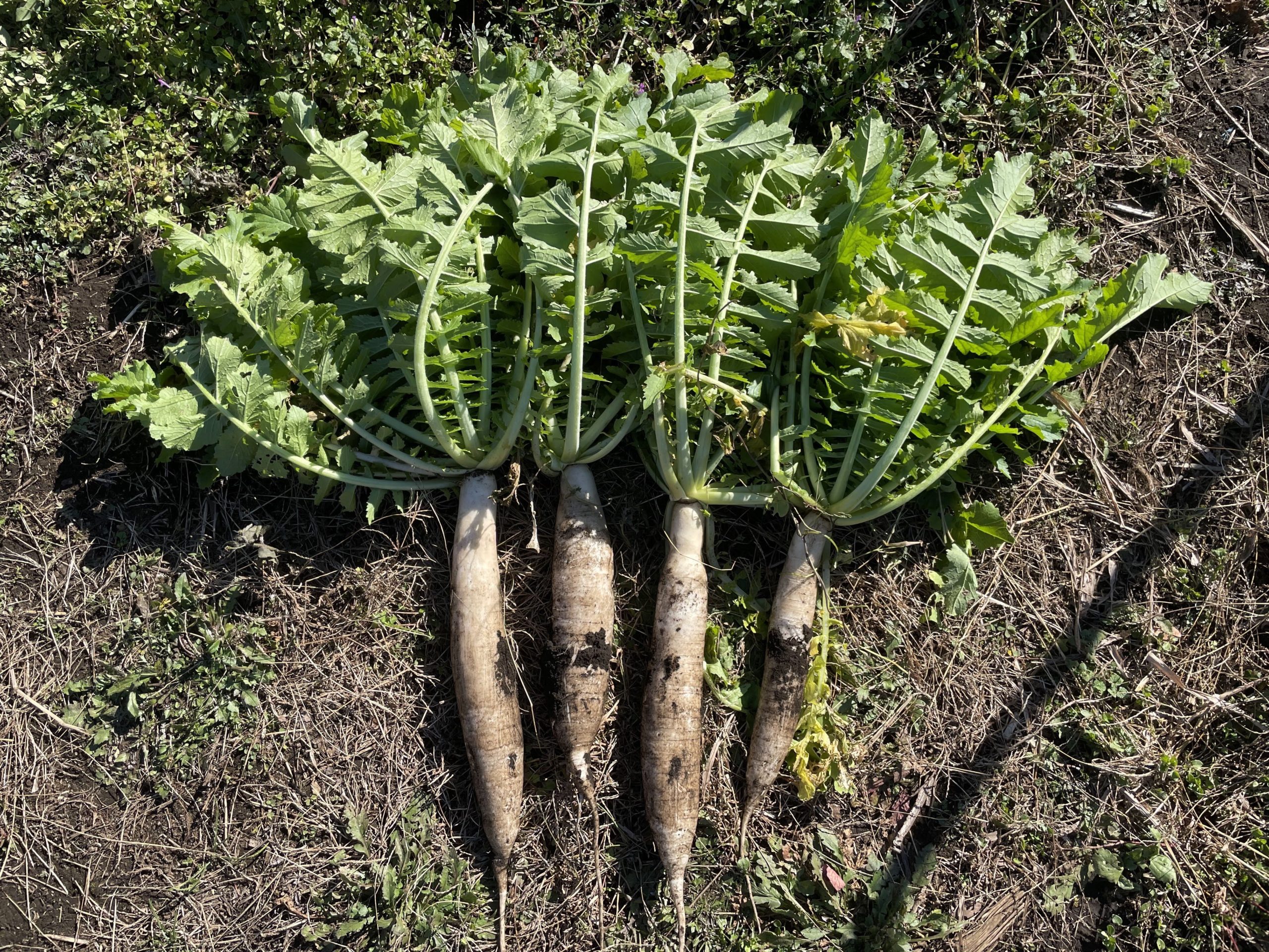 野良生え大根も大きくなっているので収穫しました。三浦大根ですが、このサイズだと持ち帰るのも、料理をするのも扱いやすいので重宝します。