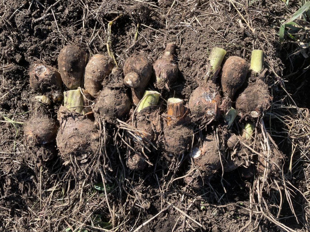 掘り上げてみると‥しっかり芋がついていました!昨年の倍くらいはあるかな?サイズもちょうどいい感じです。子芋を外して、親芋は来年の種芋にします。