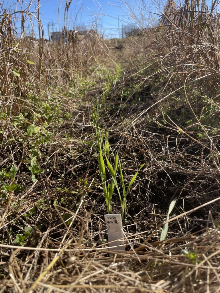 こちらは11/6播種のもち麦。寒さで若干葉が黄色くなってきました。昨年と同じ感じ‥少し心配です。