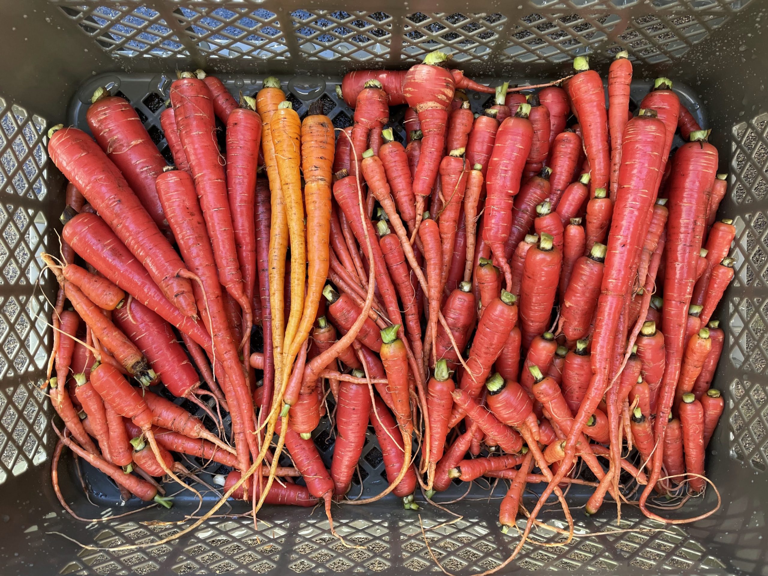 自宅に戻って人参を洗ってみると、3本ほど、金時人参らしからぬ色のものが混ざっていました。自家採種ですが、人参はこの品種しか作っていないし、人参を開花するまで放っておく人も周囲に居なそうなので、交雑の可能性は低いと思います。