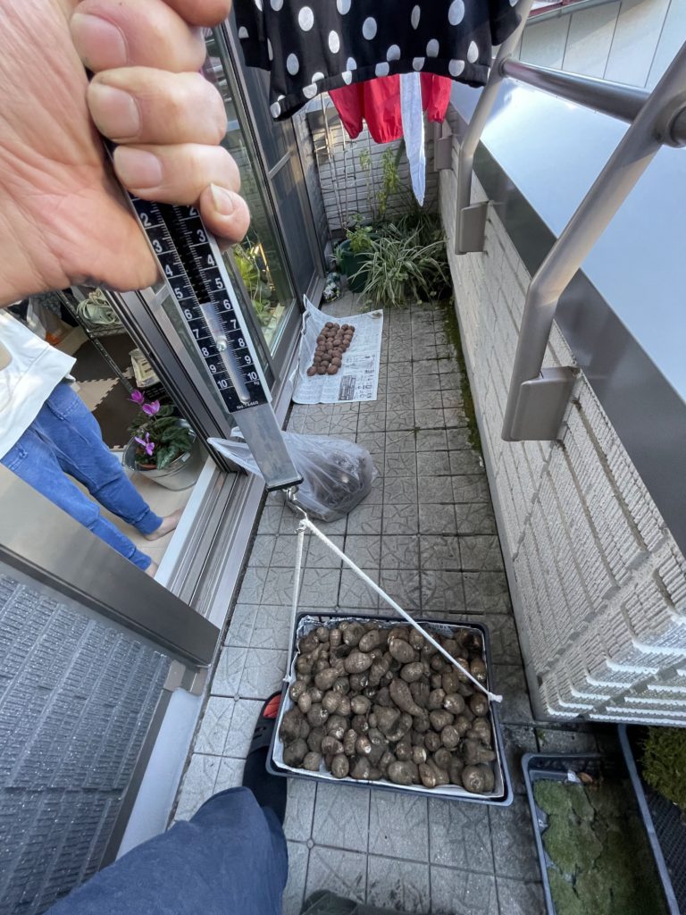 里芋は重さを測ってみると、ちょうど7kgでした。種芋がおよそ3kgなので合計10kgの収穫量です。
