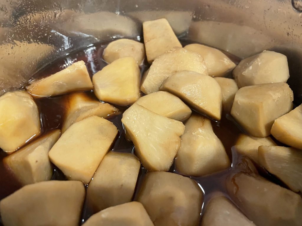 早速煮物にして食べました。やっぱりこの芋は美味しい。もともとこの畑でもらった芋を、マキノフ農園で育てて、4年経ってまた元の農地に戻ってきたことになります。一体なんという品種なのか。興味はあるけれど調べ用がありません‥。