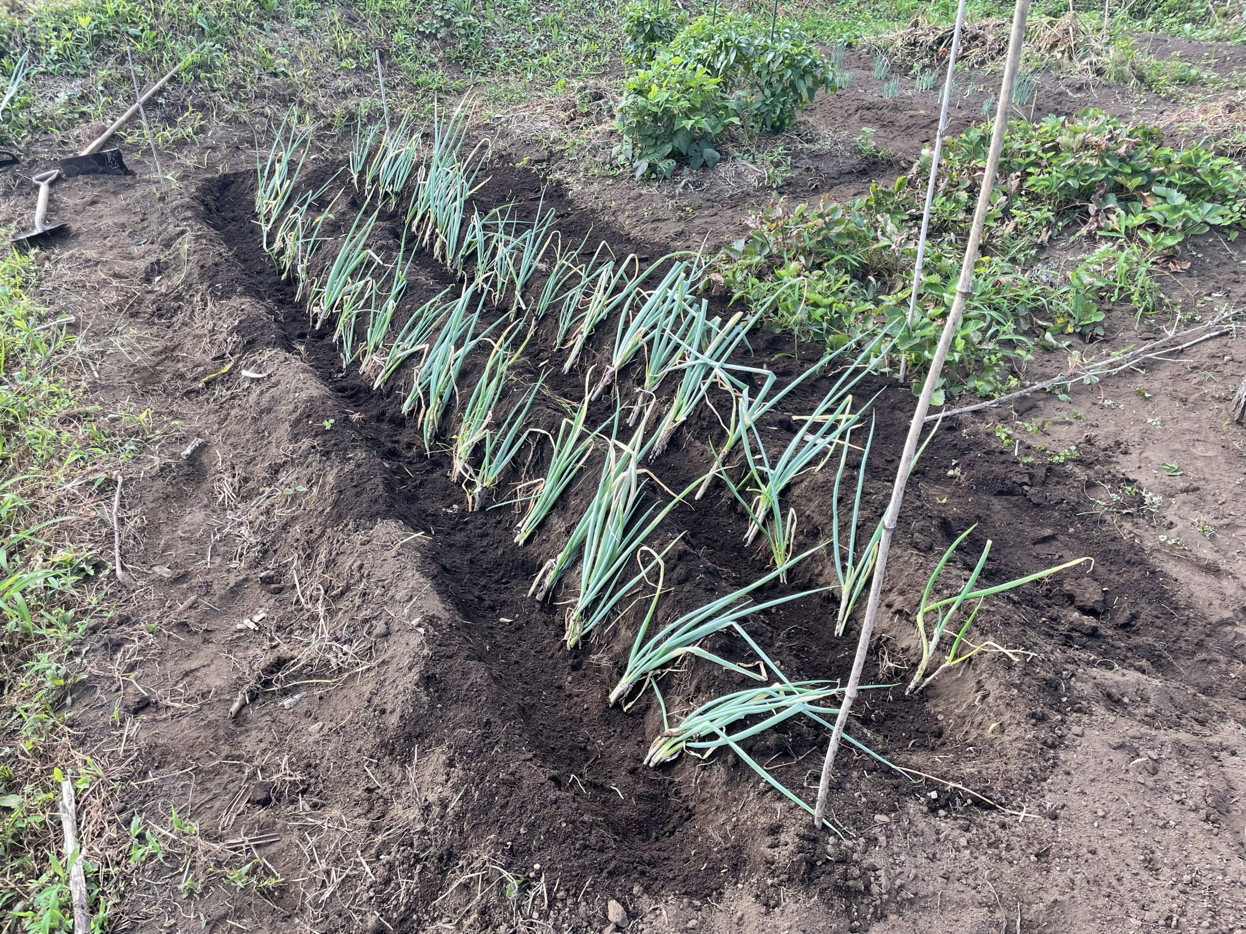 自然農 九条ネギの移植 草に埋もれてしまっていた九条ネギ。もうすぐじゃがいもの植え付けなので救出も兼ねて掘り起こします。植え付け場所に鍬で溝を深く掘ります。結構笹の地下茎が蔓延っています。掘り上げた九条ネギを軽く株分けして植え付けます。ウチではこれだけの量の九条ネ... 2021.08.28 自然農