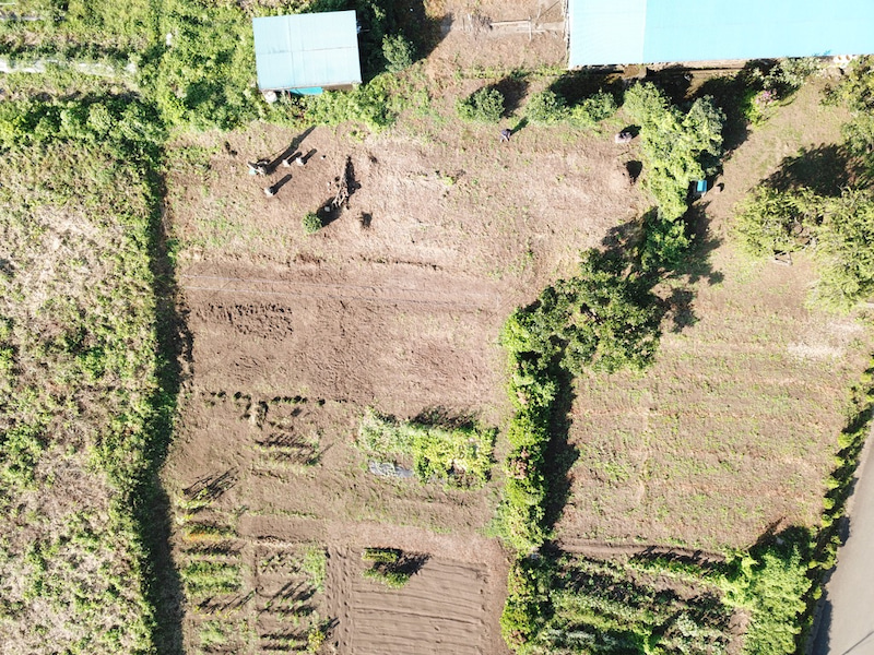 出勤前にのらくまへ。今日はドローンを飛ばし畑を空撮。既に草取りや整地が始まっている状態だけれど、畑になる前の状態として記録。長靴を逆さにしたような形だが、その長靴で言う「足」から「足首」のあたりまでが我が家が管理する敷地。早くここが一面グリ...